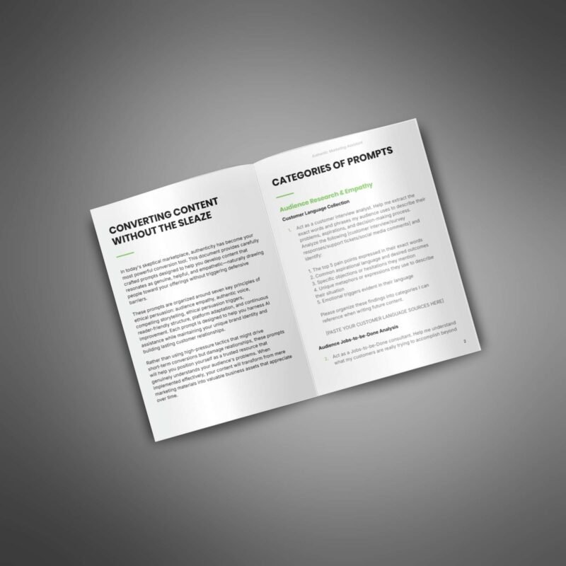 This prompt pack helps your customers create authentic marketing content by using AI-driven prompts that focus on honesty, empathy, and clarity. It offers support for writing content that builds trust, connects with audiences, and promotes products without sounding pushy or fake.
