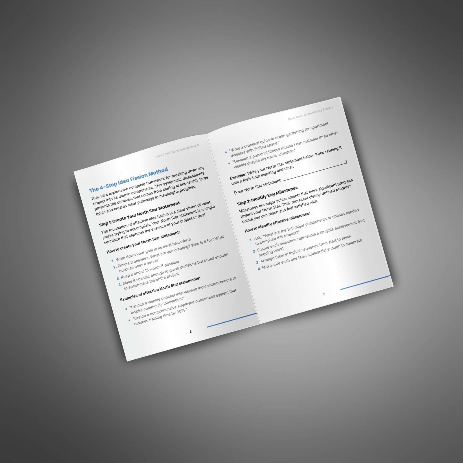 This guide helps your customers break down overwhelming projects by offering clear, actionable steps for setting strong goals, mapping milestones, and turning tasks into simple 5-minute actions. It provides a strategic system to help them reduce stress, beat procrastination, and make steady progress on any big idea or project.