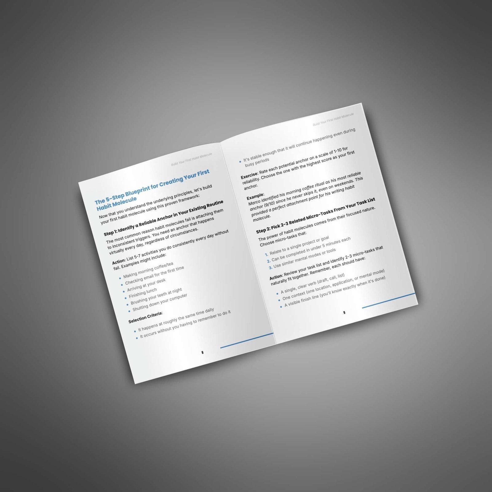 - Habit Molecule Blueprint: Step-by-step method for building habits using connected micro-tasks.