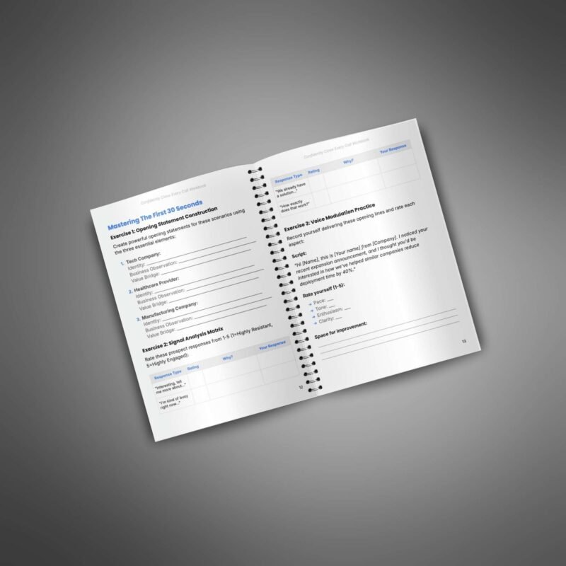 This workbook is an essential resource for your customers, guiding them to master sales calls and close deals with confidence. Through structured exercises and hands-on practice, it helps them refine their sales techniques, handle objections, and develop a winning approach to cold calling.