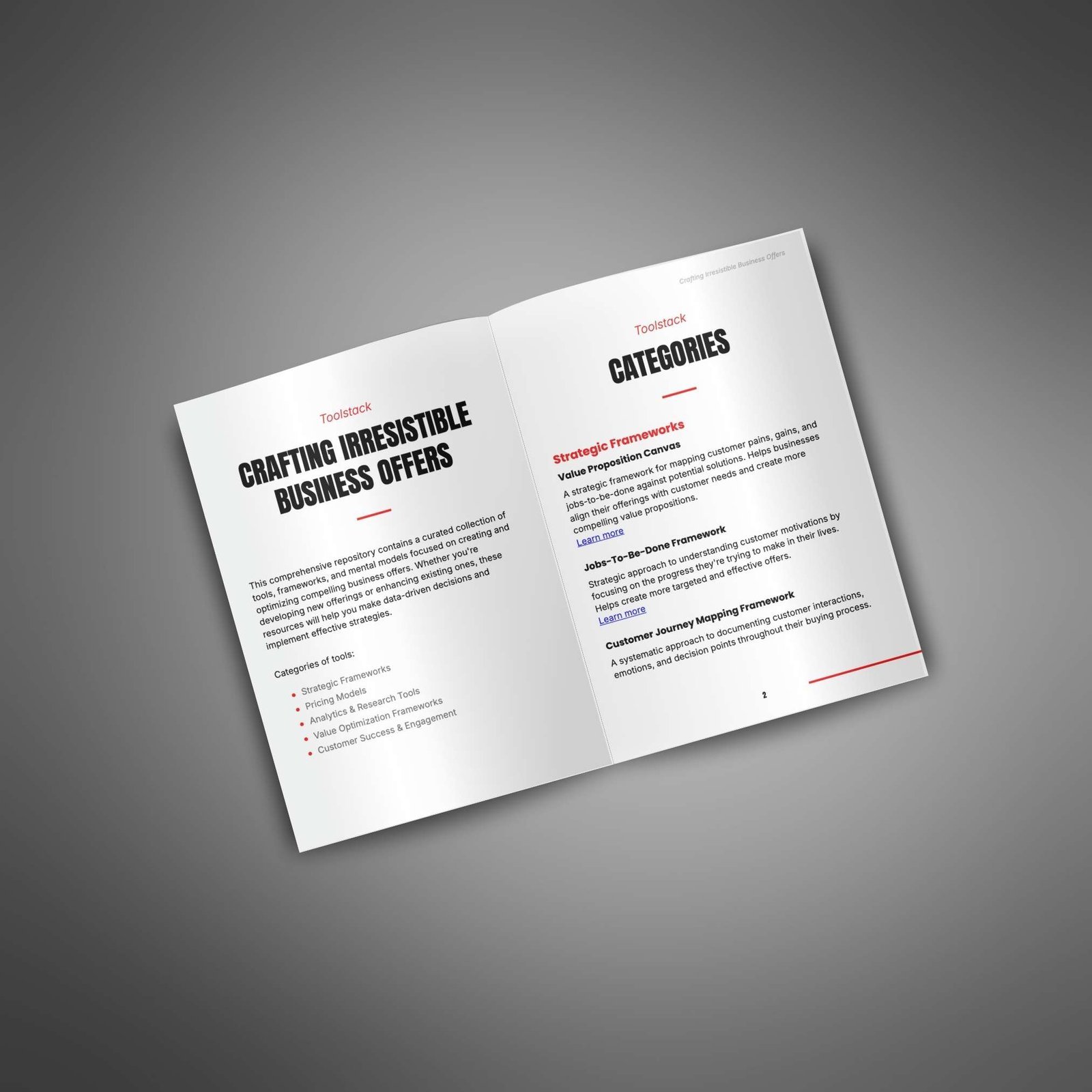 This toolstack provides your customers with a curated collection of essential resources to create and optimize strong business offers. It offers a variety of tools organized into key categories, helping your customers craft better value propositions, smarter pricing models, and stronger customer engagement, giving them everything they need to build offers that truly sell.