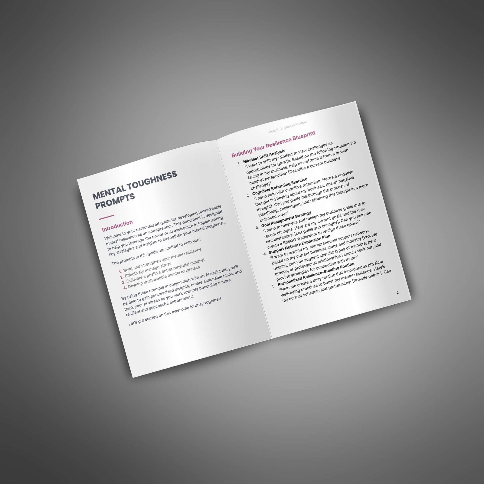 Prompt pack designed to help your customers use AI to build mental toughness, manage stress, and develop resilience for overcoming challenges in their business.