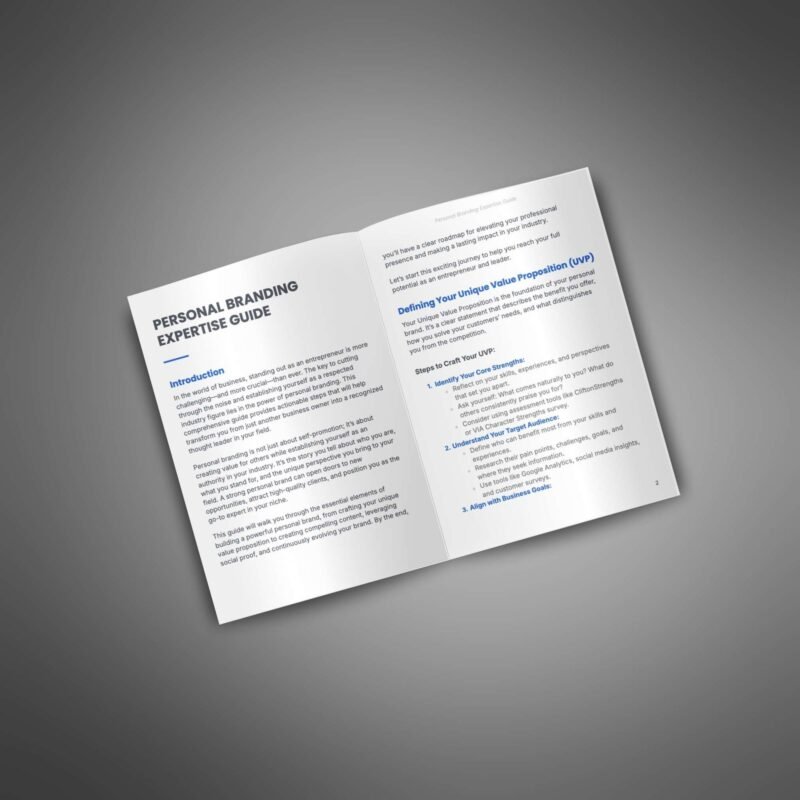 This guide helps your customers create and grow a powerful personal brand by offering clear, actionable steps for defining their unique value, creating engaging content, and building credibility in their industry. It provides a strategic roadmap to help entrepreneurs stand out, attract new opportunities, and establish themselves as trusted thought leaders.