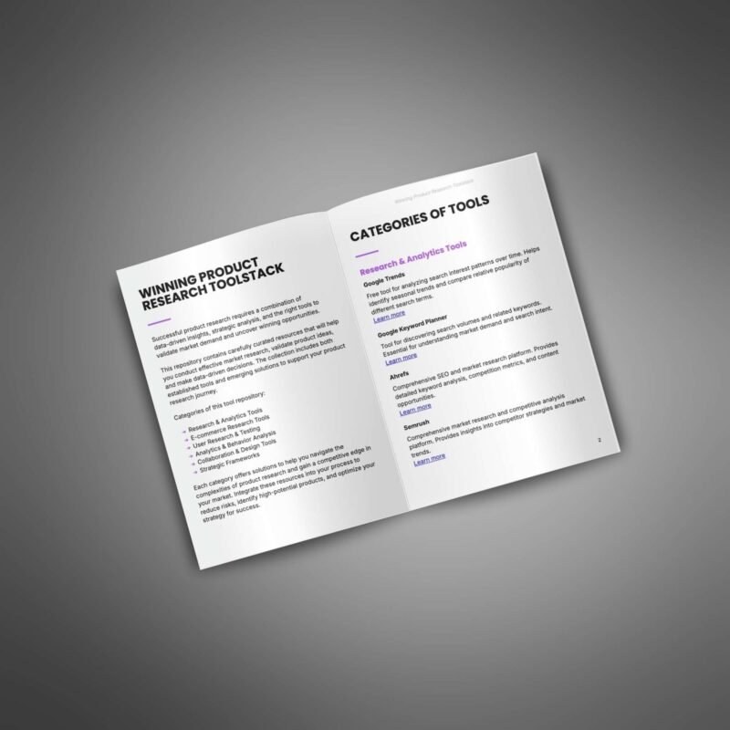 This toolstack provides your customers with a curated collection of resources for conducting effective product research. It offers tools to analyze markets, understand customer behavior, and validate ideas, equipping them with everything they need to identify winning products and optimize their strategies.